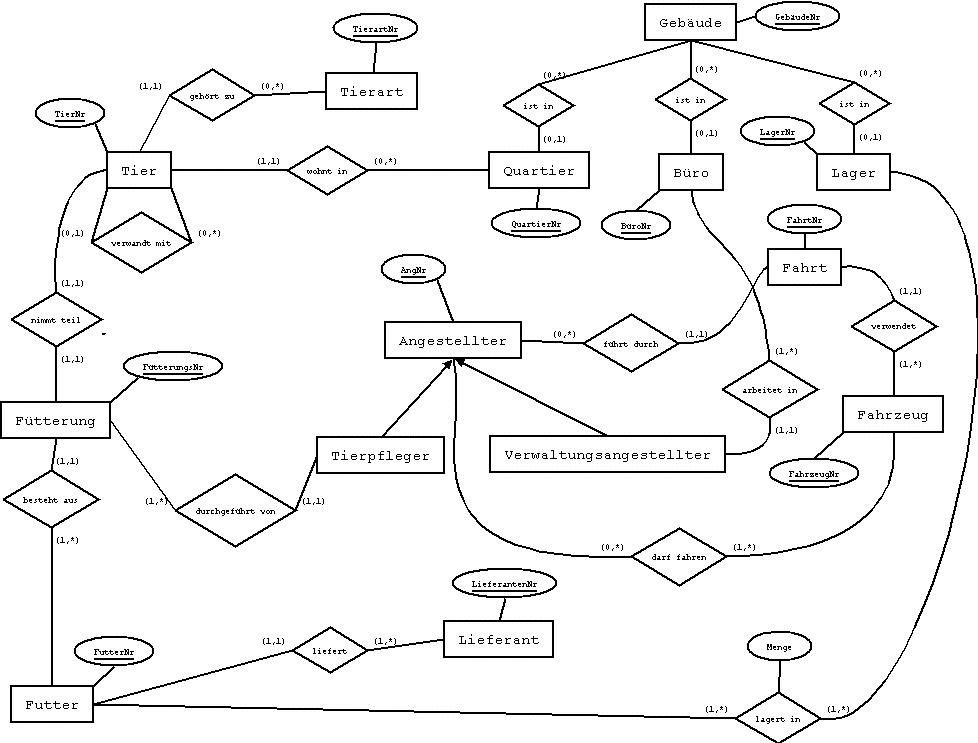Sprachen führen dann auch zu unterschiedlich organisierten Datenbanksystemen. Beschreiben wir die „Welt“ als eine Menge von Objekten (Entities), zwischen denen beliebige Beziehungen (Relations) bestehen, dann erhalten wir ein Netzwerk, in dem die Objekten durch unterschiedliche Beziehungen miteinander verknüpft sind. |