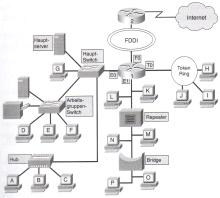 | Die Abbildung zeigt viele verschiedene Topologien, die durch Netzwerkgeräte miteinander verbunden sind. Dieses Netzwerk weist einen Komplexitätsgrad auf, wie er für Schulnetzwerke oder kleine Unternehmensnetze typisch ist. | |||||||||