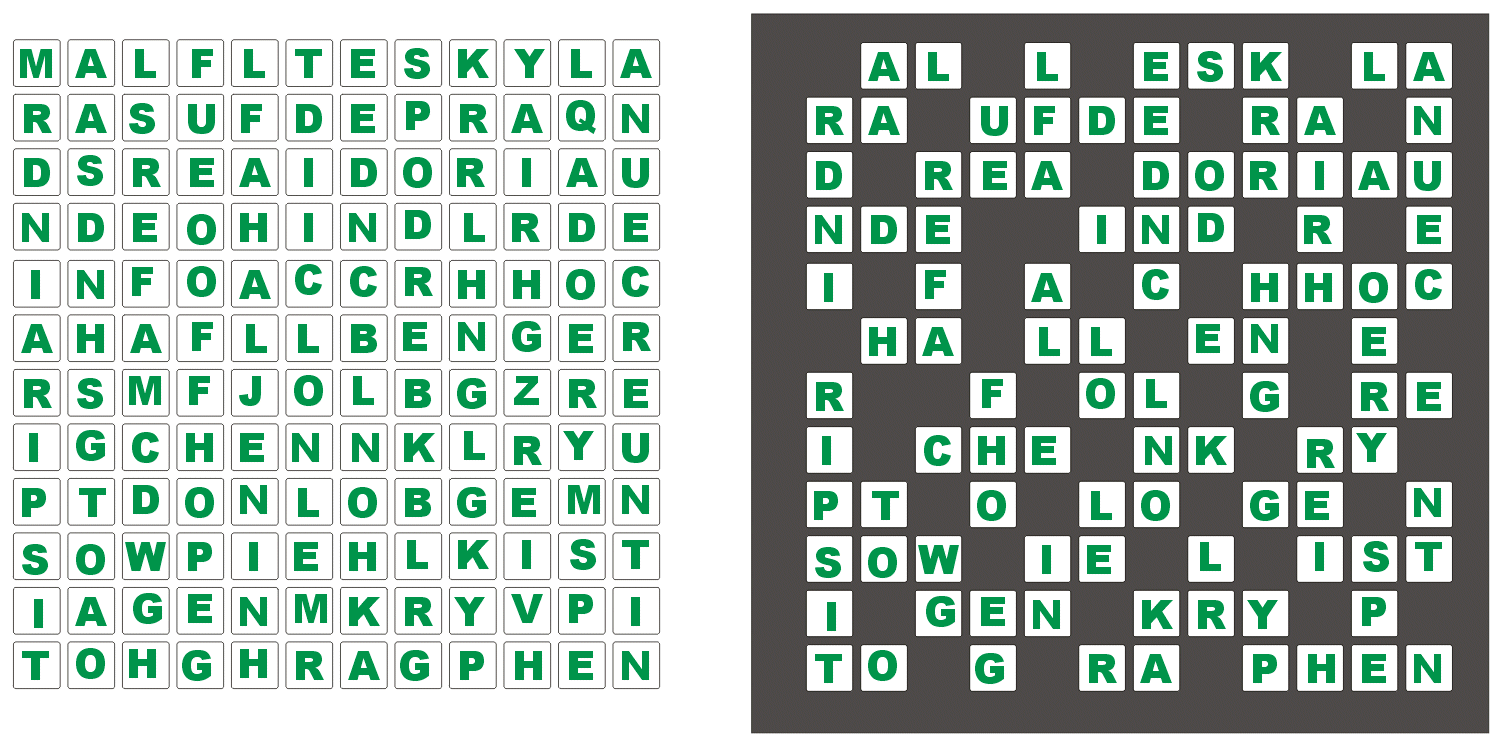 | Geheimschriften konnten entweder als unverfängliche, offen verständliche Nachricht oder in (winzigen) sichtbaren graphischen Details einer Datei, Schrift oder Zeichnung erscheinen. Letzteres bezeichnete man auch als Semagramm. | |||||||