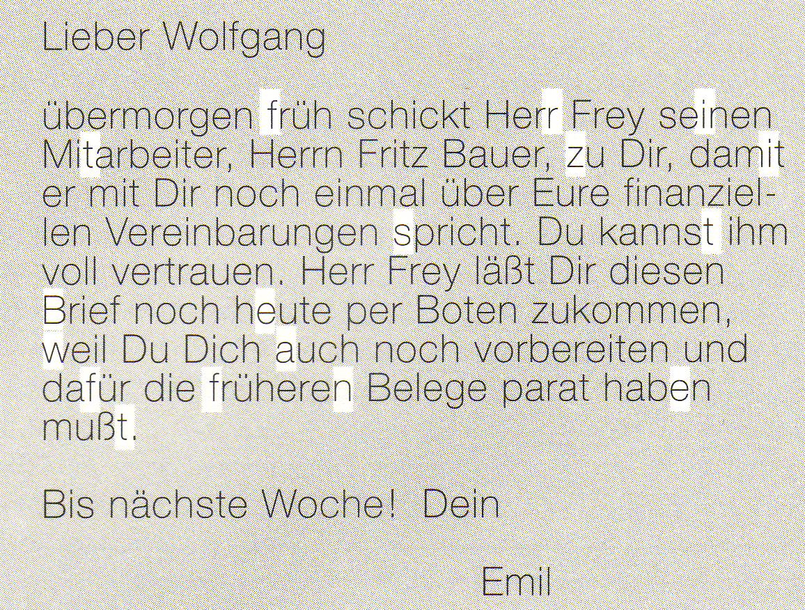 Die versteckten Hilferufe eines der Opfer des 1996 verurteilten Säuremörders von Hamburg. In der Verstärkung einzelner Buchstaben ist im oberen Ausschnitt das Wort « hilf» versteckt, während unten die Frau mit den verstärkten Buchstaben «luz» auf den Vornamen «Lutz» des Mörders hinweist. |