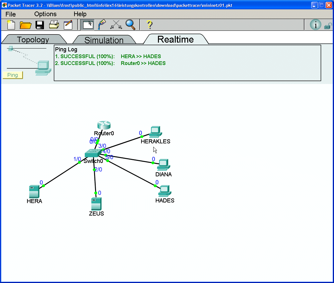 Mittels des Programmes "Packet Tracer" lassen sich kleine Netzwerke aufbauen, konfigurieren und testen. Wir benötigen zu Aufgabenlösung Router, Switches, Server und Workstations. Diese müssen mit Fast-Ethernets verbunden werden und erhalten ihre IP-Adresse über den DHCP-Server (das vermittelt in Packet Tracer allerdings der Router). | ||||