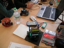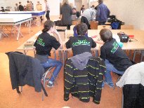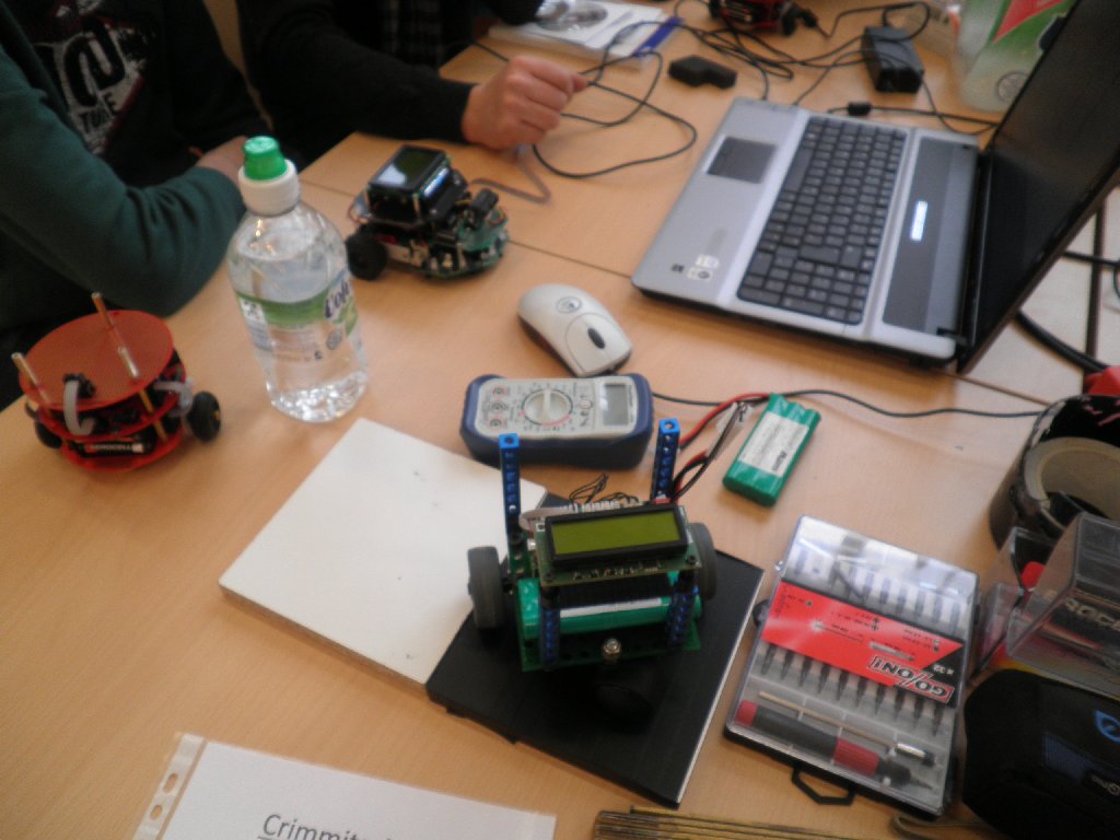 nicht genau fest. Jetzt wissen wir mehr - vor allem, das wir zu groß sind. Schnell zeigte sich aber auch, dass die kleinen fertig konfektionierten Roboter samt ihrer gut eingerichteten und abgeschotteten Meßelektronik sowie hervorragend vorbereiteter Software ernste Konkurrenten sind - die Kleinen sind also erwachsen geworden und funktionieren zwischenzeitlich sehr präzise. Zwar wissen wir mehr von unseren Bausteinen, aber die anderen fahren besser!!! In den nachfolgenden Fotos lässt sich auf Grund der reinen Fülle nicht mehr immer zuordnen, wer wer ist ;-) |