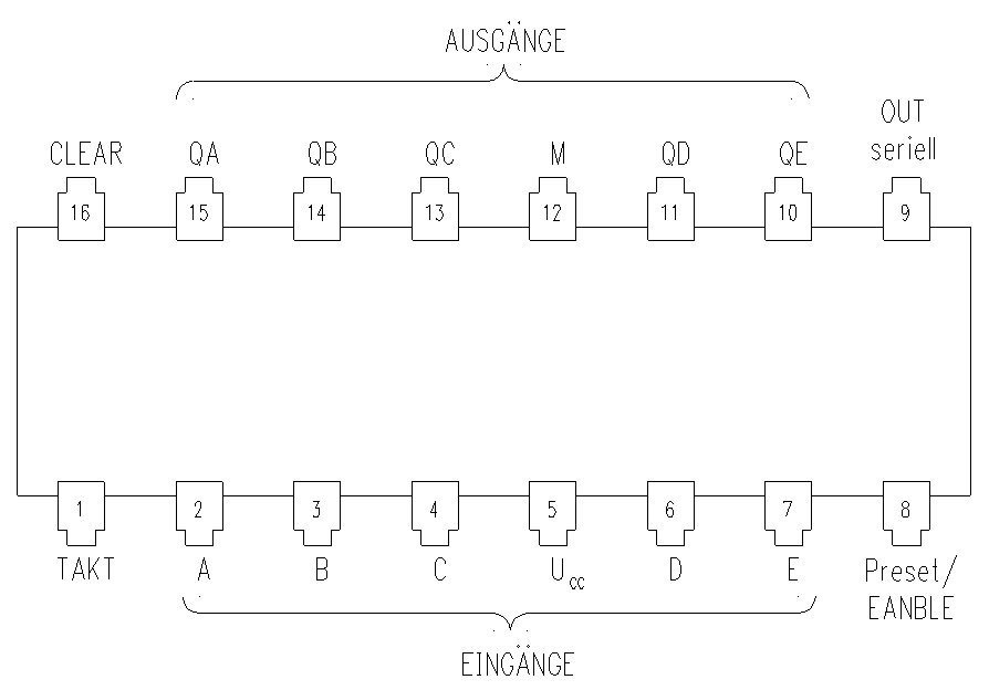 Pin-Belegung des 14-poligen DIL's 7496, 74LS96, DL96, 74HCT96