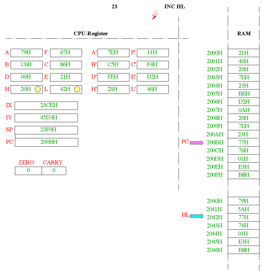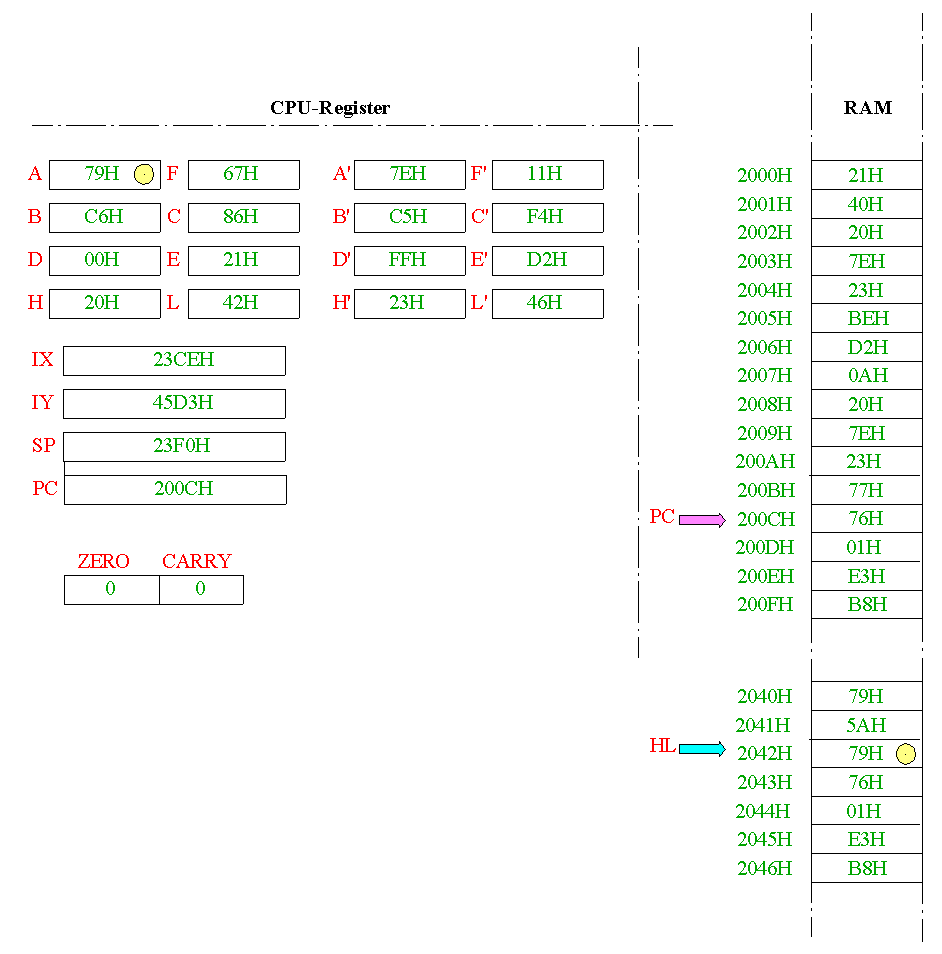 CPU- und RAM-Abbild bei Eintreffen des Befehls LD (HL), A