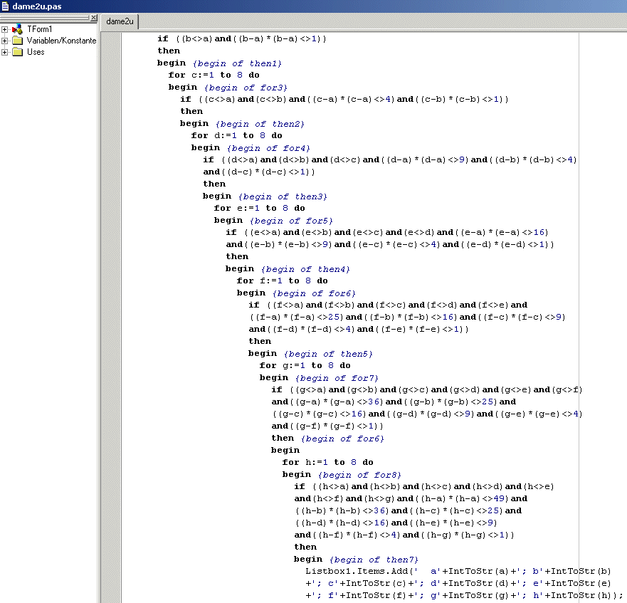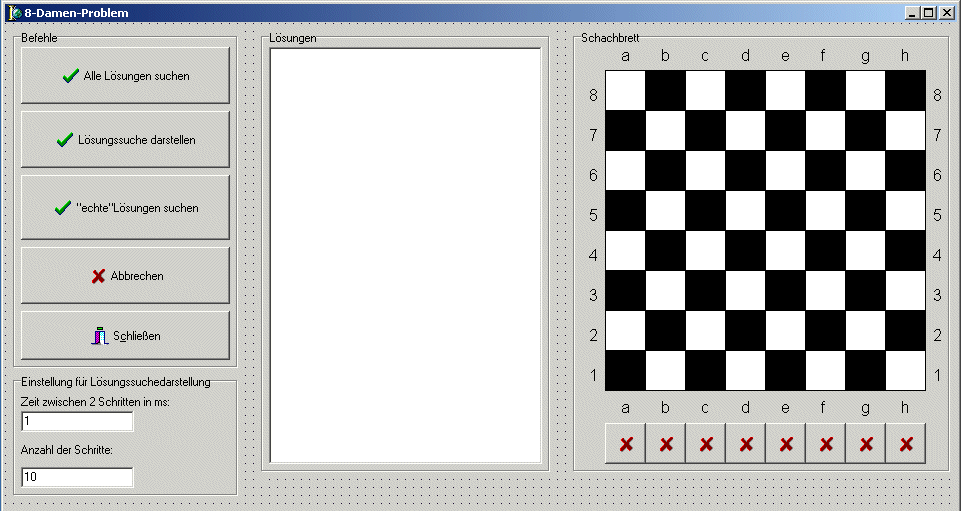 | Aufgabe war es das 8-Damen-Problem zu lösen, d. h. alle Möglichkeiten zu finden,