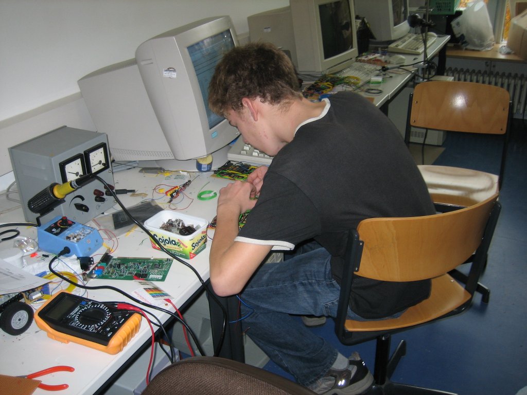 Tina mit dem Goldhändchen (Tina lötet eine Schaltung und selbige funktioniert auf Anhieb - das kommt uns schon etwas spanisch vor, denn Murpys Gesetze besagen da etwas ganz anderes), Martin, das informationstechnische "Urgestein" und Verantwortlicher zu allen Fragen zu Programmen und mathematischen und logischen Problemen; André, der besonnenene und überlegte Tüftler sowie Johannes, der voraus berechnende und analysierende Techniker vor dem Herrn ;-) Das ist der harte Kern im Oktober 2006 - Philipp Oehme ist während unserer Projektwoche im Herbst noch dazu gestoßen |