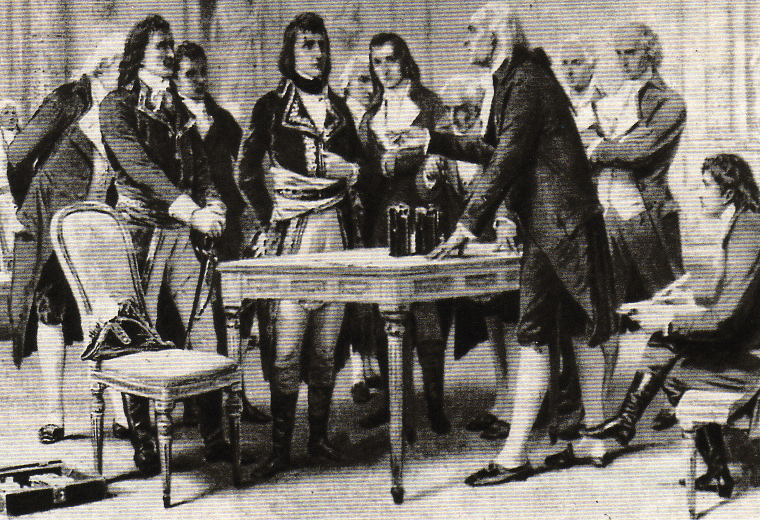 1801: Alessandro Volta vor der galvanischen Kommssion in Paris Er erklärt Napoleoi Bonaparte die Wirkung seiner elektrischen Säule und der Tassenkrone.