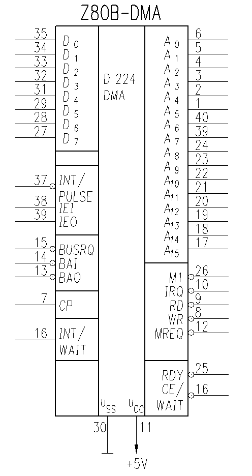 Im nichtaktiven Zustand des DMAC reagiert der Anschlußss als Eingang und steuert im U858 die Datenrichtung bei der Übertragung von Statusinformationen. Während des DMA-Betriebs hat er die gleiche Wirkung wieder CPU-Anschluss RD (Ausgang zur Steuerung von Lesevorgängen). |