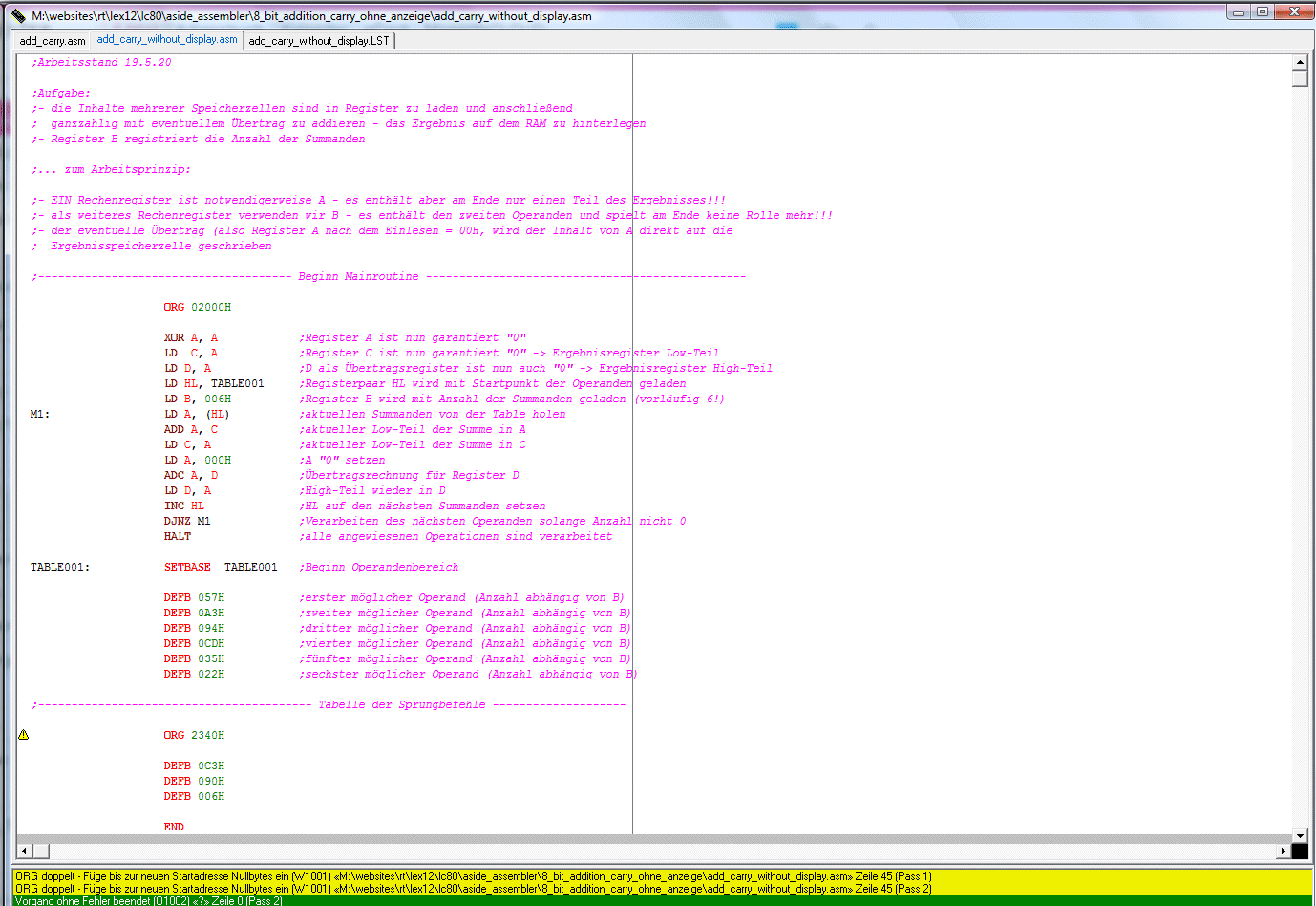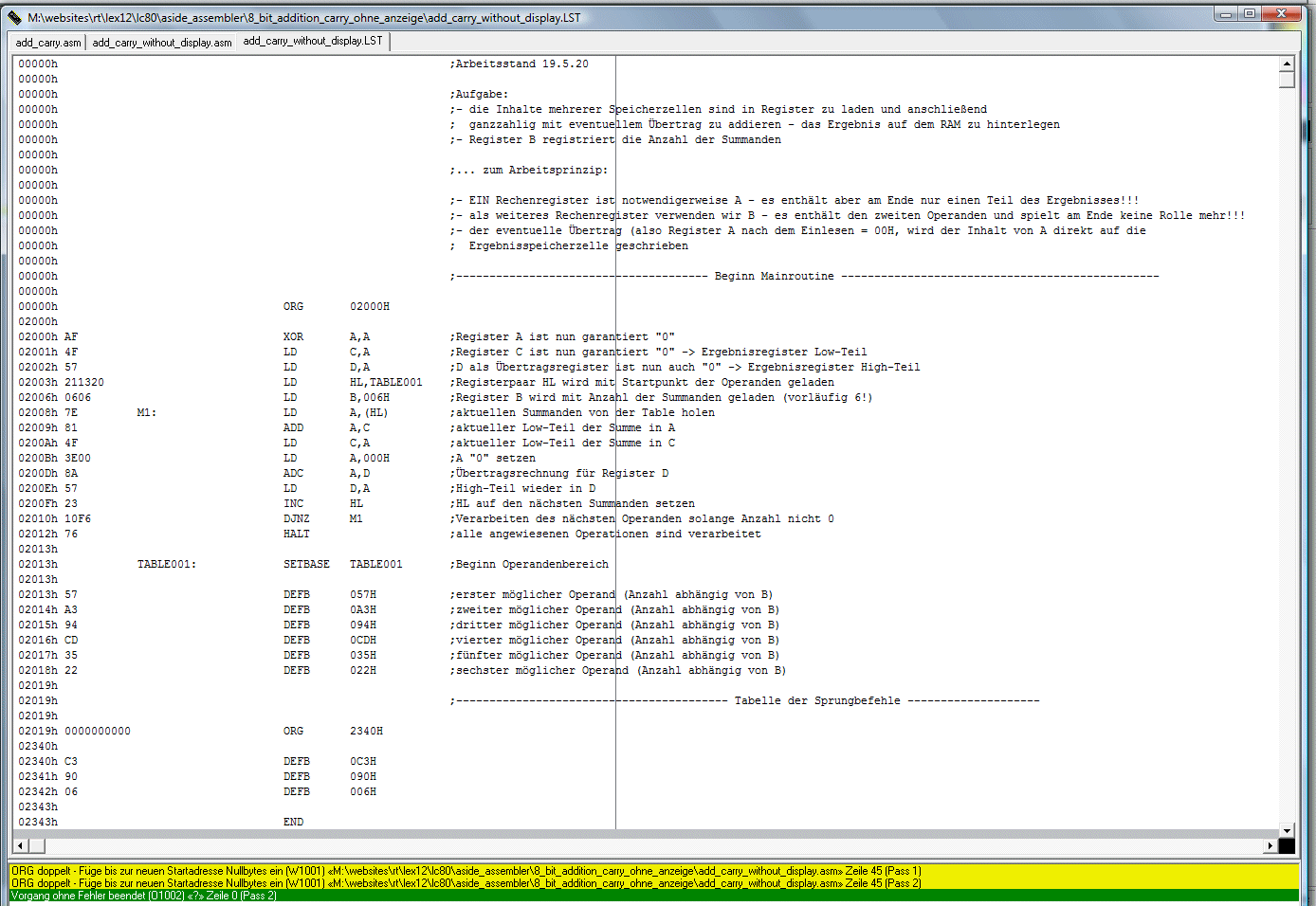 Aufgabe: mehrere Register werden mit Operatoren aus einem definierten dicht zusammen liegenden RAM-Bereich geladen und anschließend addiert - das Ergebnis sowie ein eventueller Übertrag werden definiert auf dem RAM hinterlegt!