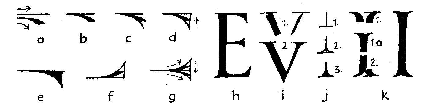 | Das Schreiben der Serifen Waagerechter und gebogener Strich (a, b). Die Feder dreht auf die linke Federkante (e) und wird nach oben (d) geführt. Der „Kopf" (Serif) wird ausgefüllt (e). Nach oben (f) und beiden Seiten (g) geführte Serifen. Beispiel für die drei Möglichkeiten (h) der Serifen. Bildung der Serifen bei schräger (i), senkrechter (j) und waagerechter (k) Federhaltung.' legen.. Sie ist für wichtige Inschriften und ähnliches die am besten geeignete Schrift. Wie wir schon an ihrem „Skelett", der konstruierten Blockschrift (Abb. 20), gesehen haben, ist der auffallende Unterschied von runden und eckigen, breiten und schmalen Buchstaben ihr besonderes Merkmal. |