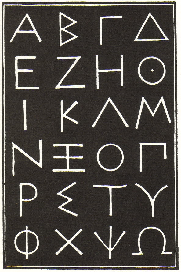 | Es ist anzunehmen, dass bei der Schriftformung auch die mesopotomische Keilschrift eingewirkt hat (Abbildung 7). Mit dem Handel brachten die Phönizier auch ihre schneller schreibbare Schrift nach Griechenland (Abbildung 9), wo sie eine weitere Umwandlung erfuhr und wo sich vor allem ihre klaren geometrischen Formen herausbildeten, in denen schon Grundformen unserer Großbuchstaben sichtbar werden. (Abbildung 10) | |