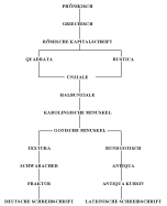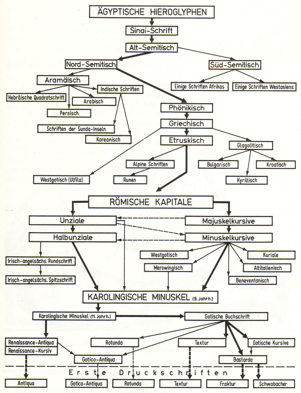 1. Ordnungssystem zur Schriftentwicklung 2. Vorstufen der Schrift 3. Ideenschrift 4. Wortbildschrift 5. Wortlautschrift 6. Lautschrift 7. Zusammenfassende Übersicht 8. Römische Kapitalis 9. Unzialschriften 10. Karolingische Minuskel 11. Schriften in Deutschland und Italien 12. Schriftträger |