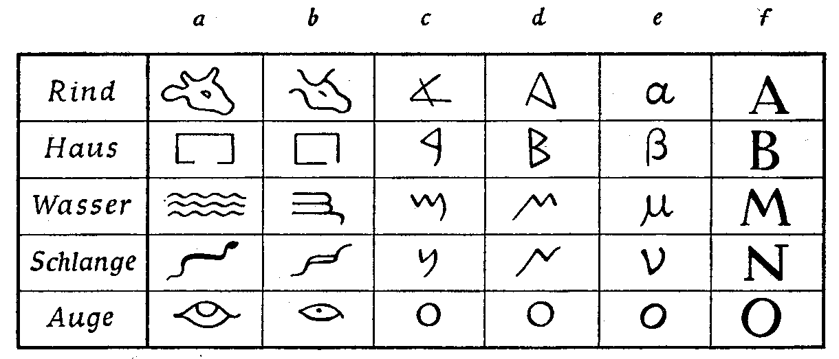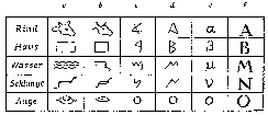 | Mit Ausnahme der chinesischen Schrift bilden sie die Grundlage für die heute in Europa angewandte Schrift. Der Weg unserer Buchstaben führt von der Wortbildschrift der Ägypter (Abbildung 6) zur Lautschrift der Semiten (Abbildung 8), die von den Phöniziern übernommen wurde. | |